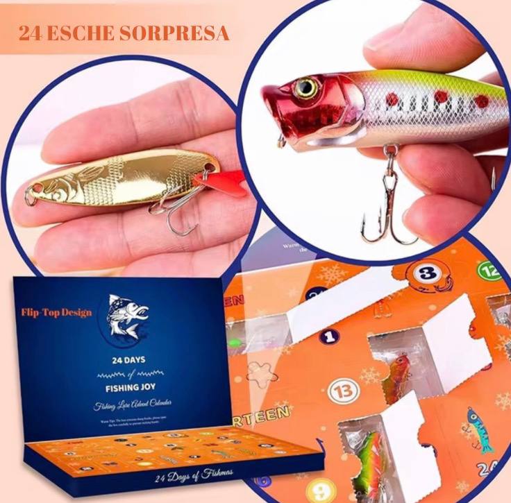 All'interno del pacco è incluso il calendario dell'avvento PESCAVVENTO contenente 24 esche artificiali diverse